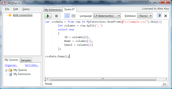 You can then parse the CSV in with normal linq queries, for example this simple linq expression will find people whose name "alex". Please note the intellisense drop down will only in linqpad pro edition (certainly worth the money if you ask me!)